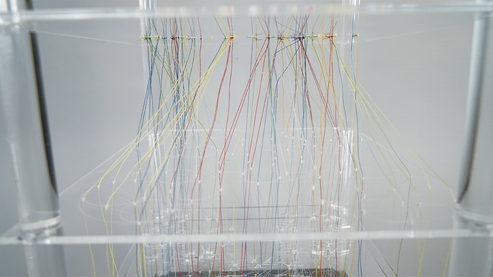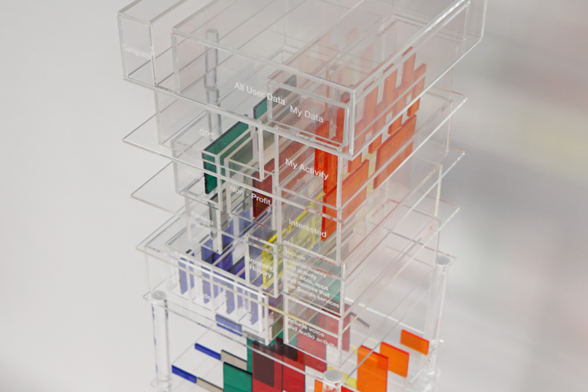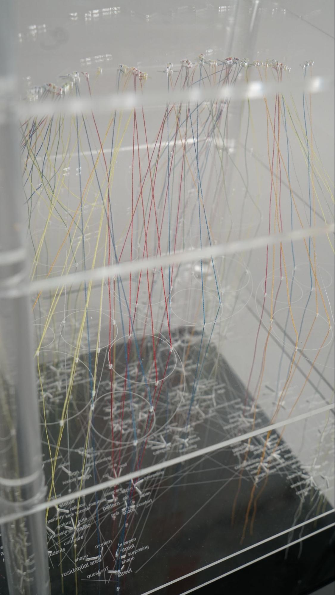 Tanahara’s algorithmic and embodied streams of data were translated into a two-layer architectural sculpture. The upper layer renders the algorithm in Brutalist form: acrylic planes and geometric columns represent how Google Maps structures information. This metaphor is strikingly, almost uncomfortably apt. Brutalism’s massive, opaque forms are imposing yet meant to be inhabited. They mirror the algorithmic infrastructures that guide us daily without ever fully revealing their inner logic. Both promise rational order while operating well beyond our comprehension.