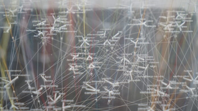 Below, the lower layer sprawls in contrast: threads and organic lines forming a network of embodied observations. Drawing on Metabolism, the Japanese architectural movement embracing growth and transformation, Tanahara creates a softer geography. Her attention proves fluid: in Whitechapel, she noticed Asian cultural elements, while in Notting Hill, she focused on light and nature. Where the brutalist layer calculates, the metabolic one breathes, serving as a reminder that bodies still notice things algorithms never suggest, even if we can’t claim those observations are entirely untouched by digital life.
